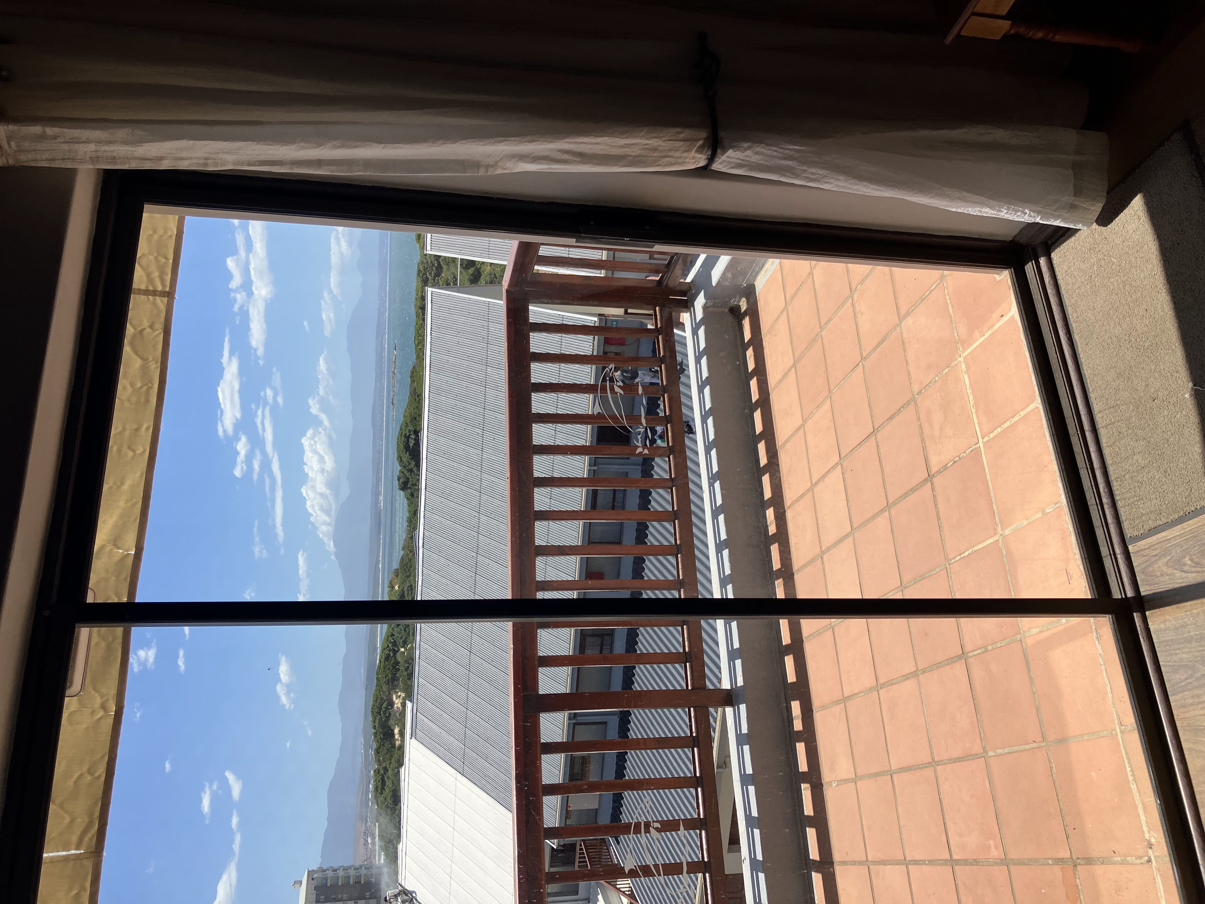 Large balcony with ocean view and a retractable awning. It also has a view of the pool and braai area.